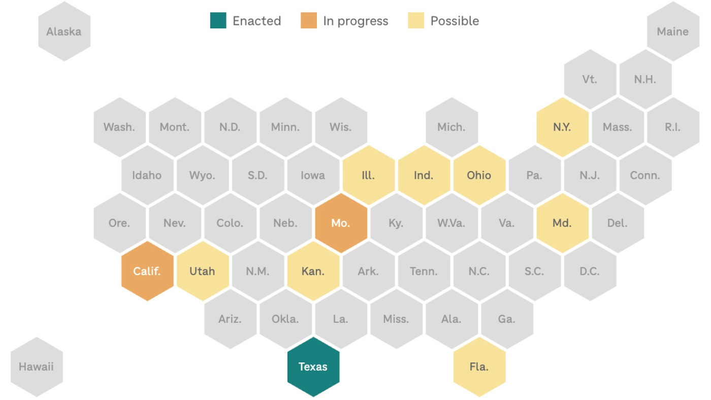 The governors of Illinois and Maryland have left the door open to redistricting that could yield an edge for Democrats in a congressional seat or two in each state. New York could also try to redistrict but couldn’t allow it to take effect until the 2028 election. Then there are two outlier states. Ohio’s current map is expiring because it didn’t meet state requirements for bipartisan support when it passed in 2022. That could end up yielding Republicans a couple more advantageous seats.