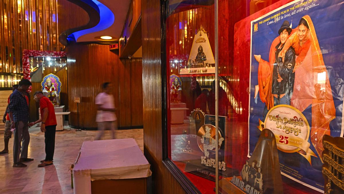 A painting of Indian actors Shah Rukh Khan and Kajol Mumbai’s Maratha Mandir theatre since its debut