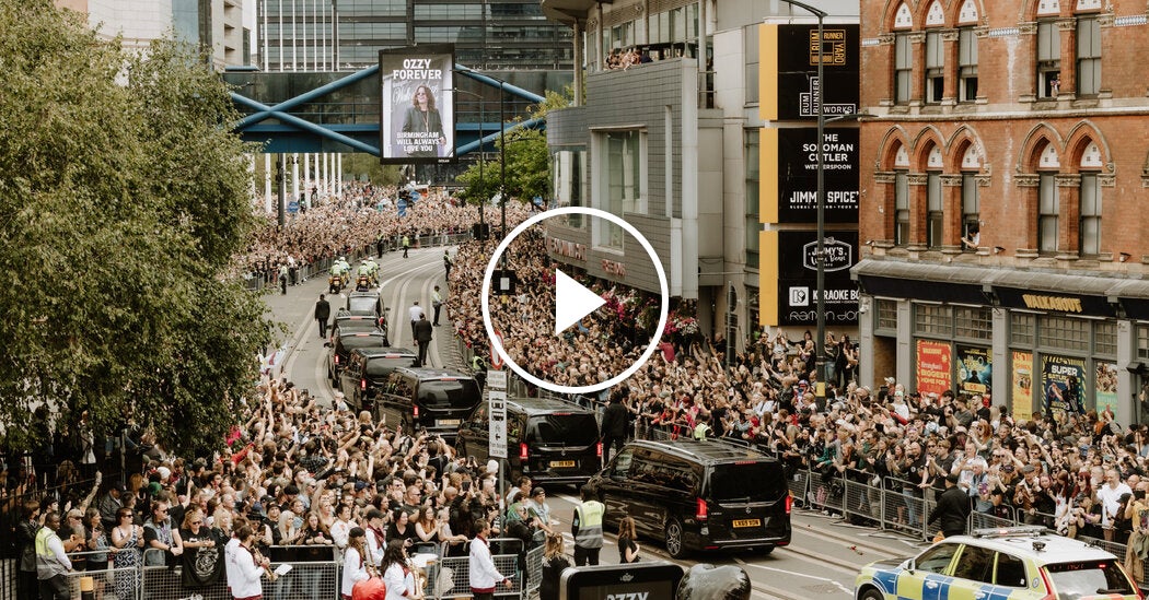 new video loaded: Family and Fans Pay Tribute to Ozzy Osbourne at Funeral ProcessionBy Monika Cvorak•July 30, 2025A cortege took the singer’s coffin through the streets of his hometown, Birmingham, England. His family stepped out to look at tributes at Black Sabbath Bench, an attraction that has become a place of pilgrimage.Recent episodes in CultureShow more videos from Culture