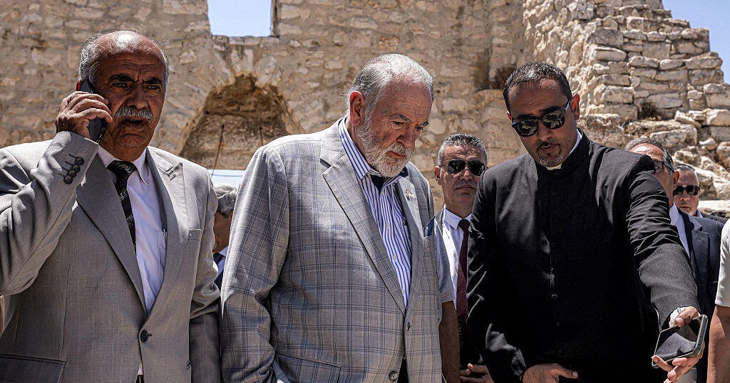U.S. Ambassador to Israel Mike Huckabee, center, and the Palestinian mayor of the village of Taybeh, Suleiman Khourieh (left), tour the fifth-century Church of Saint George in the Palestinian Christian village of Taybeh, northeast of Ramallah in the occupied West Bank, on July 19, 2025. The church was targeted by an arson attack earlier this month.
