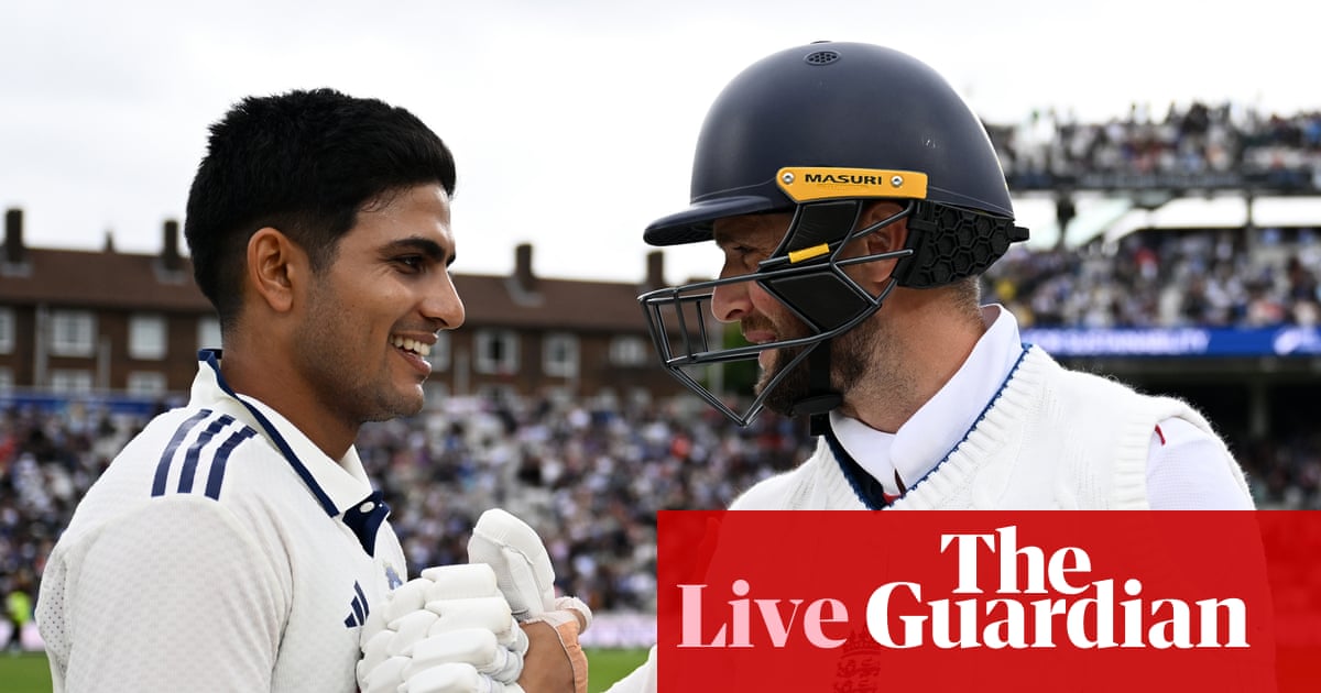 WICKET! Atkinson b Siraj 17 India win by six runs!Off stump dances into the past. The match! The series tied! What a game.England’s Gus Atkinson is bowled out by India’s Mohammed Siraj to give India victory. Photograph: Kirsty Wigglesworth/APSiraj is congratulated by Dhruv Jurel (rear). Photograph: Paul Childs/Action Images/ReutersShareUpdated at 12.07 BSTKey eventsShow key events onlyPlease turn on JavaScript to use this featureThe crowd are waiting, soaking in every moment. The players are all out on the pitch, Indian smiles broad as the ocean, England rueful.“Why do people knock this format, it is just so wonderful.” says Nasser. “If we let this go, we will have done the game a great disservice.”Share“I’m sitting in a garage on a Greek island while my car is being fixed and there’s no reception !” writes Julian Birkby. “My last update was the Overton wicket and I’m losing my mind with the stress of it all. Thanks for keeping me updated – I guess it will all be over when I can drive back over the hill to where there is reception.”I’ve got bad news for you Julian…“Sorry to be that guy Tanya.. England F***ed it up…Cannot wait for us (Aussie supporter here) to crush Bazball in the Ashes…”Oh Pramith Pillai, too soon.ShareTime for your emails, at last:“At The Oval.” writes Ronald Grover. “A great match, needless to say. And as for India keeping the field out at the end of each over at the end, the only answer is that it must have been sporting, surely They didn’t want to win by bowling at Woakes.”That would be astonishing, if right.Suzy (over 83) is not pleased “As Simon’s American wife, you can rest assured that he will be sleeping on the couch tonight.”This six-run win is India’s closest victory in their Test history.ShareJaiswal blows kisses to the crowd. Siraj, with his arm around Gill, waves the match ball, Krishna brandishes a stump. They are applauded round the ground. What a match. What a series.ShareSiraj, still clutching the ball, speaks to DK, who translates. He says “when he dropped that catch yesterday he felt very guilty, he wanted to be the guy who came here to finish it off. “ He sure did. Finishes with five for 104.With seven wickets in hand yesterday, England needed 73. Now India do a victory lap of the ground.ShareSiraj leaps six feet in the air, raises both arms to the sky. Gill goes straight to Woakes and gives him a heartfelt handshake. Atkinson tucks his bat under his arm.India’s Shubman Gill shakes hands with England’s Chris Woakes after India won the match. Photograph: Paul Childs/Action Images/ReutersShareUpdated at 12.02 BSTWICKET! Atkinson b Siraj 17 India win by six runs!Off stump dances into the past. The match! The series tied! What a game.England’s Gus Atkinson is bowled out by India’s Mohammed Siraj to give India victory. Photograph: Kirsty Wigglesworth/APSiraj is congratulated by Dhruv Jurel (rear). Photograph: Paul Childs/Action Images/ReutersShareUpdated at 12.07 BST85th over: England 367-9 (Atkinson 17, Woakes 0) England need 7 to win A low full toss first ball, and they run two. Woakes grimaces in pain, looks as if he might be sick. Atkinson is the calmest man in the ground. Swings and misses. Gill and Krishna have a long chat. Atkinson misses again. And again. India keep the field out to the last ball and once again, England sneak the single. Woakes yet to face a ball. Huge applause from the crowd.“What’s the cricketing equivalent of Alex Ferguson’s famous Squeaky Bum Time? I don’t think I’ve unclenched for 15 minutes.”Chris Woakes runs between the wickets with his arm in a sling. Photograph: Shaun Botterill/Getty ImagesShareUpdated at 11.59 BST84th over: England 364-9 (Atkinson 14, Woakes 0) England need 10 to win Woakes at the non-striker’s end. Atkinson is going to have to do this in boundaries. Siraj with the ball. Every fielder on the rope. Woakes, left arm tucked inside his jumper, the crowd have their hands over their eyes. No!!! Atkinson heaves at Siraj on one knee, a slog sweep, the ball flies to long on where Akash Deep paws it over the rope. Could he have held on? On a good day with a following wind. But he didn’t. With two balls left, a long talk between bowler and captain, they keep the field out. A full toss is missed by Atkinson, slides past leg stump, but is stopped by the keeper. Siraj falls to his knees. India keep the field out, for reasons I can’t explain. It’s wide, they go for a the run, the keeper throws at the stumps, but misses. Woakes completes the single in some pain.Akash Deep of India reacts after failing to catch a shot from Gus Atkinson of England which then went for six. Photograph: Gareth Copley/Getty ImagesShareUpdated at 11.53 BSTWICKET! Tongue b Krishna 0 (England 357-9)A yorker for the ages!83rd over: England 357-9( Atkinson 8, Woakes 0) England need 17 to win Atkinson doesn’t take a single to the first three balls of the over. They risk the fourth, a miscued hook, but a wild throw from Siraj is rescued by his teammates. And then Tongue’s stumps are splattered. Enter a one-armed Chris Woakes.“I wish to formally apologise to all of England and my American wife who supports England cricket (and plays for Germany), for jinxing this,” writes Simon B. “Yesterday, with Root and Brooks set, I messaged my old cricket team chat and said: I don’t want to jinx it, but England are going to win this.In retrospect I was a fool.”Simon, the fat lady is yet to sing (though I can hear her warbling in her warmup).England’s Josh Tongue is dismissed by India’s Prasidh Krishna. Photograph: Ben Whitley/PAKrishna (left) celebrates the dismissal of Tongue. Photograph: Kirsty Wigglesworth/APEngland’s Chris Woakes walks out to bat. Photograph: Paul Childs/Action Images/ReutersShareUpdated at 11.55 BST82nd over: England 356-8( Atkinson 7, Tongue 0) England need 18 to win Siraj from the pavilion end. Atkinson takes a single first ball, 