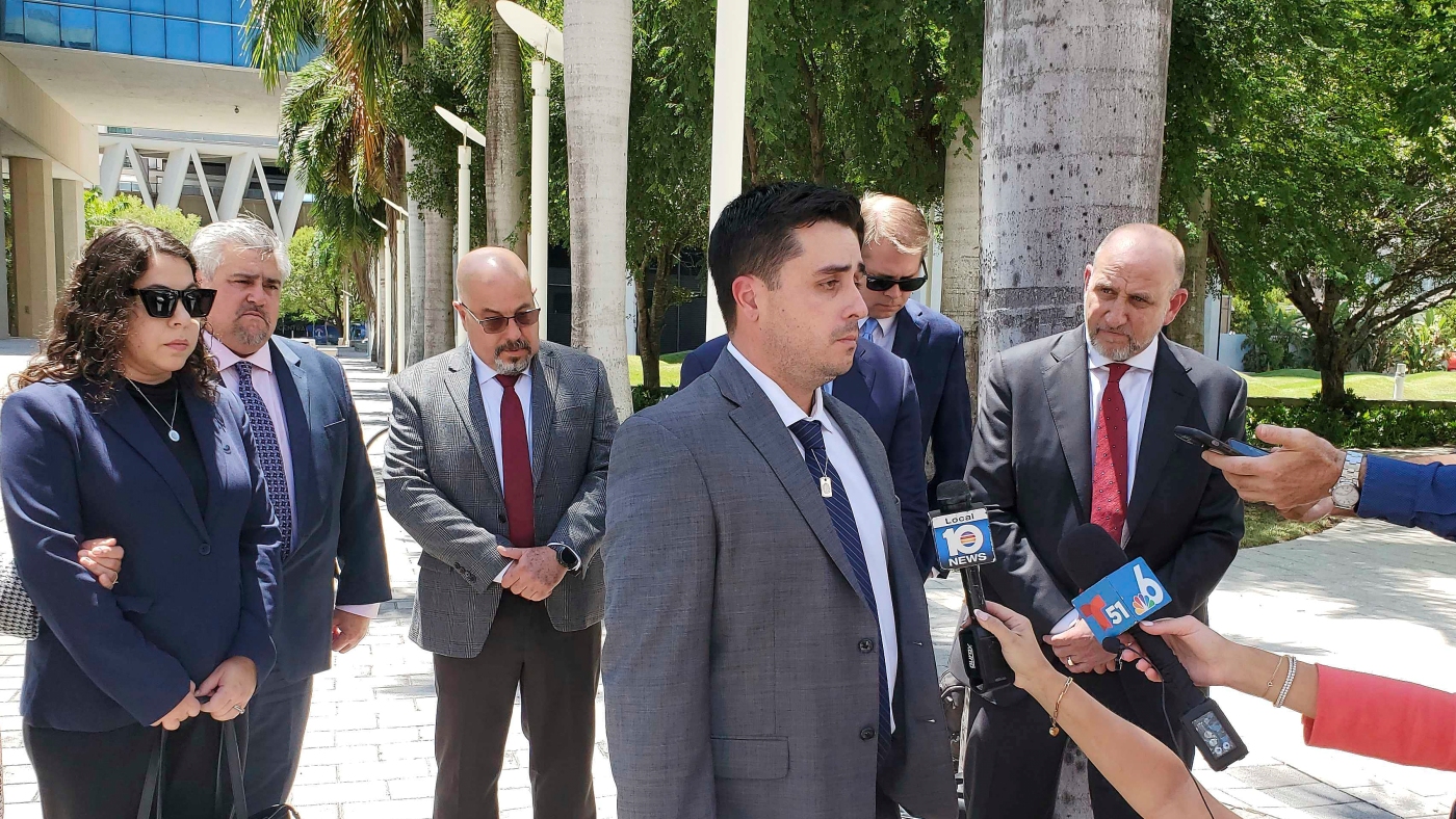 Dillon Angulo, who was seriously injured in a Florida crash involving Tesla’s Autopilot driver assist technology, speaks to reporters outside the federal courthouse in Miami on Friday.