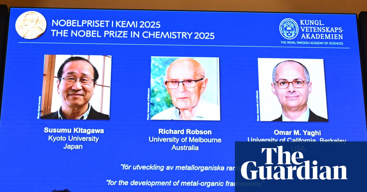 The Nobel prize in chemistry has been awarded to three scientists who created revolutionary porous materials that can harvest water from desert air, capture carbon dioxide from industrial facilities and remove toxins from water.Susumu Kitagawa, of Kyoto University, Richard Robson, of the University of Melbourne, and Omar Yaghi, of the University of California, Berkeley, shared the 11m Swedish kronor (about £871,400) prize awarded by the Royal Swedish Academy of Sciences in Stockholm.The trio found ways to combine metal ions and organic molecules into highly porous structures through which liquids and gases could flow. Tens of thousands of such materials have since been made for applications ranging from storing hydrogen to removing forever chemicals from water and recovering valuable rare earth metals from waste.The scientists were honoured “for the development of metal-organic frameworks”, or MOFs, which have such potential that they have been called the material of the 21st century.Speaking at the prize announcement, Prof Heiner Linke, the chair of the Nobel committee for chemistry, said: “They have found ways to create materials, entirely novel materials with large cavities on the inside, which can be seen almost like rooms in a hotel, so that guest molecules can enter and also exit again from the same material.“A small amount of such material can be almost like Hermione’s handbag in Harry Potter. It can store huge amounts of gas in a tiny volume.”The research began in 1989 with Robson, a chemist born in Glusburn, West Yorkshire, who moved to Australia after studying at Oxford and Stanford universities. Inspired by the structure of diamonds, he combined copper ions with a four-armed molecule to make pyramid-shaped molecules. These bonded together to form crystals strewn with cavities.Robson realised the potential for the structures but they were unstable and tended to fall apart. It took further work from Kitagawa and Yaghi to turn metal-organic frameworks into the valuable materials they are today.Kitagawa showed that similar structures based on cobalt, nickel and zinc were not only stable but could be used to store and release methane, nitrogen and oxygen. He went on to show that MOFs could be tailored to different tasks and even made from flexible materials.Reached by the Nobel committee, Kitagawa said he was “deeply honoured and delighted” to receive the prize. Asked about his hopes for the future, Kitagawa said he wanted to use MOFs to extract important elements such as carbon and oxygen from the air and with green energy turn them into useful materials. “This is my dream,” he said.Yaghi became fascinated with chemistry at the age of 10 after sneaking into the school library, which was usually locked, and plucking a book at random from the shelves. He was brought up with his siblings in a single room in Amman, Jordan, with no running water or electricity. At his father’s insistence he went to study in the US.Frustrated with the traditional way of building new molecular structures, Yaghi developed a more precise approach that was more like assembling pieces of Lego into large crystals. In the 1990s, he revealed MOFs that resembled nets held together with copper or cobalt. Later, he created an extraordinary zinc-based MOF. A couple of grams held an area as large as a football pitch, meaning it could absorb a vast amount of gas for its size.Dr Becky Greenaway, a chemist at Imperial College London, said: “Lots of chemists have been wondering when metal-organic frameworks would get the Nobel prize, and it’s finally happened.“Their discovery has enabled a whole range of applications, from gas storage and separations to drug delivery, and also opened up other areas, including porous liquids – liquids with holes in – which are showing promise in carbon capture and catalysis.”
