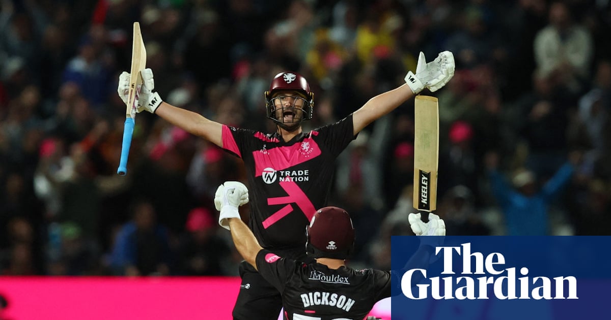Will Smeed, with the help of some late-night umpty from Sean Dickson and Lewis Gregory, carried Somerset to a thrilling victory in the T20 Blast final, as they hauled in a record-breaking run-chase against Hampshire that one moment silenced the crowd, the next had them roaring each pin ball flying into, or sometimes over, the stands.“It’s unbelievable,” said Smeed as the smoke from the celebration fireworks drifted into the night, 94 runs in one pocket, player-of-the-match award in the other.“We set out at the start of the year to win the competition, and we’re glad we’ve done that. We’ve got match-winners one to 11. There’s a lot of role clarity.“Nights like this are so special. Edgbaston is an amazing place to play. The atmosphere is always great and it felt like a home game tonight. I think the most special thing is playing with your mates and helping them succeed. There is an amazing spirit in this squad and I think we’re going to have a great night!”The final was a battle of T20 big boys – with both Somerset and Hampshire on their 11th visit to Edgbaston – canny experienced campaigners. Smeed’s 94 off 58 balls had kept Somerset in the hunt to catch Hampshire’s 194 for six, even after Tom Kohler-Cadmore, in sparkling form, was bowled by an 88mph yorker by Sonny Baker – back in the limelight after his England debut. And even in the tricky middle overs as the runs dried up and the clock ticked down – with six overs to go, an imposing 76 were needed.Sean Dickson, in his last game for the club before moving to Glamorgan, was dropped by Scott Currie on seven, a lease of life that proved bad news for Hampshire as he and Smeed dragged Somerset to within 18 runs before Smeed crunched the ball to James Vince on the boundary. The pendulum might have swung, but Lewis Gregory’s sealed the deal with 18 in five balls and an over to spare, to bring Somerset their third Blast trophy – level with Hampshire and Leicestershire – and their second in three years. “We did it the hard way,” said Gregory – but no one minded, least of all the spectators roaring Blackbird in the stands.If Blast finals day hasn’t got the cachet it once had with the rise of the Hundred and franchise tournaments round the world, not to mention the scheduling squeeze, then no one at the ground had told the enthusiastic if occasionally dishevelled crowd, belting out a succession of stadium anthem specials, or the players whose despair, joy or fury was shown on the big screen, and who played entertaining cricket over 11 hours.Toby Albert anchored Hampshire’s innings with a 48-ball 85. Photograph: Craig Brough/Action Images/ReutersIt was the end of a difficult week for Hampshire, who were deducted eight points for an unfit pitch to put them in relegation danger in the County Championship, and learned that they would lose the services of their head coach, Adrian Birrell, after seven years at the club. It had looked their game to lose at the halfway stage after James Vince, with his usual casual rakishness, and Toby Albert, touch-perfect as befits the Blast’s leading run scorer in 2025, gave Hampshire a blazing start in a partnership of 97.They had both slotted fifties in their same over – Vince’s 46th in T20 Blast games – when Vince was caught. James Fuller followed soon afterwards but Albert pressed the accelerator, four times reversing his wrists and reaching the rope, a whirlwind of trick shots until Gregory finally sent him on his way for 85. Benny Howell kept up the momentum and Hampshire finished with the second highest score in Blast history. But it wasn’t quite enough.skip past newsletter promotionSubscribe to our cricket newsletter for our writers’ thoughts on the biggest stories and a review of the week’s actionPrivacy Notice: Newsletters may contain information about charities, online ads, and content funded by outside parties. If you do not have an account, we will create a guest account for you on theguardian.com to send you this newsletter. You can complete full registration at any time. For more information about how we use your data see our Privacy Policy. We use Google reCaptcha to protect our website and the Google Privacy Policy and Terms of Service apply.after newsletter promotionEarlier, Australian Chris Lynn had flamed the first T20 Finals Day hundred to take Hampshire through and ruin Northamptonshire’s hopes of repeating their quarter-final miracle. Lynn moved from 78 to 108 in the space of one devastating over, sending Lloyd Pope into a Hollies Stand of ecstatic sombreros and swaying bananas with five successive sixes. He finished 108 not out, hitting every one of Hampshire’s 11 sixes to carry them to a six-wicket Duckworth-Lewis-Stern method win.Somerset romped to a 23-run victory in the first semi final, beating an underpowered Lancashire, with Jimmy Anderson but without England’s Luke Wood, Phil Salt, Jos Buttler and Saqib Mahmood, and the overseas players Ashton Turner (back in Australia) and Chris Green (at the Caribbean Premier League).Lancashire’s chase had hinged on Liam Livingstone, whose disbelief when the third umpire upheld the onfield lbw decision when he was on 29 suggested a tickle of bat. When Lancashire retired out George Balderson only for his replacement Tom Hartley to hit his first ball straight to long-off, the die was cast.The players celebrate Somerset’s third T20 Blast triumph. Photograph: Nigel French/PA