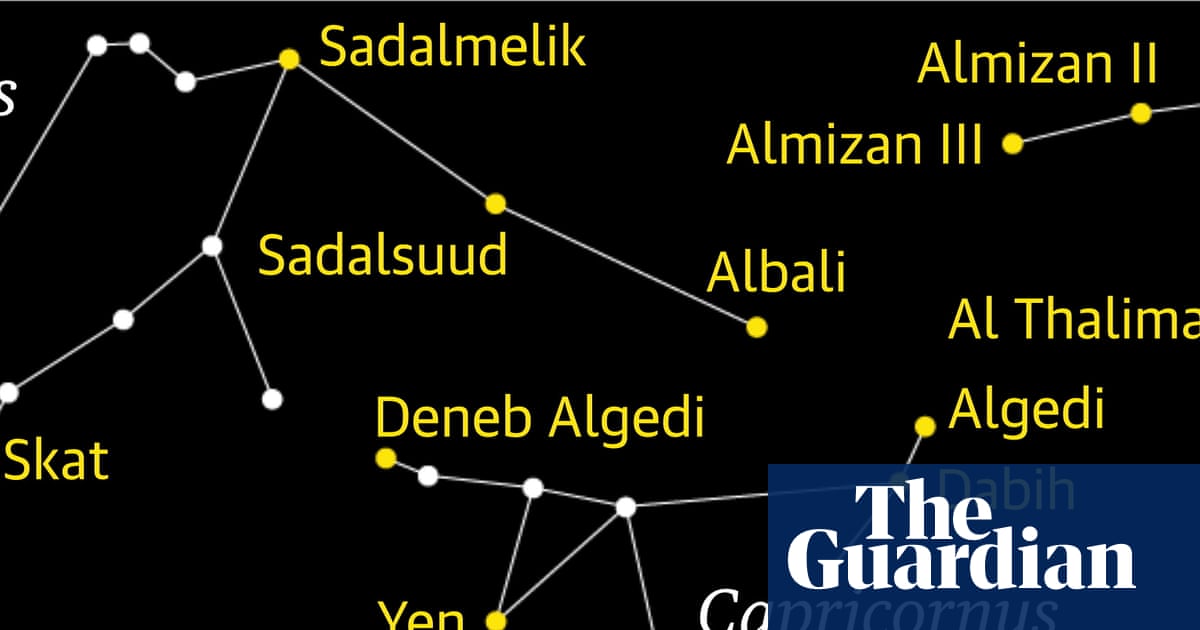 For those of us in the northern hemisphere, September is an excellent time to search for the faint constellation of Capricornus, the sea goat, one of the oldest recognised constellations. It appears on Ptolemy’s second-century list of 48, and even before that on Babylonian clay tablets that date from a few thousand years BC.Capricornus is depicted to be a chimera, a mythical creature containing the body and head of a goat and the tail of a fish. In Greek mythology it is often associated with Amalthea, who hid the young Zeus from his child-devouring father, Cronos, or Pan the shepherd god.The constellation straddles the ecliptic, the annual path of the sun through the sky, which means it is one of the 12 constellations of the zodiac.The chart shows the view looking south from London at midnight as 1 September becomes 2 September. The brightest star in the constellation is Deneb Algedi. Locate this and then work your way around the constellation. Pause when you get to the star Algedi and see if you can make out its fainter companion, situated in close attendance.From the southern hemisphere, Capricornus appears much higher in the north-western sky.