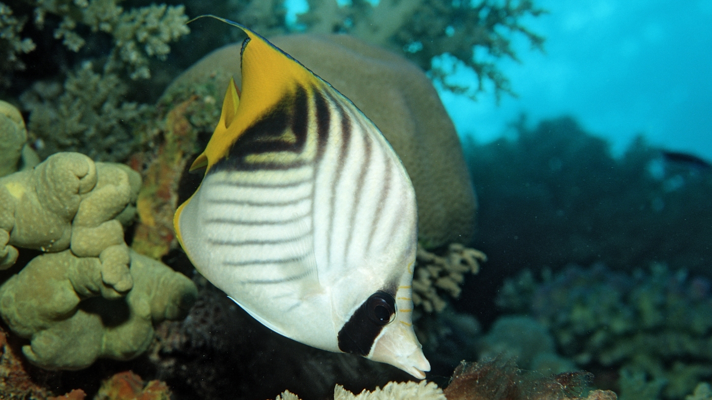 A threadfin butterflyfish swims though the Red Sea. A recent experiment suggests that these fish may experience something like pleasure.