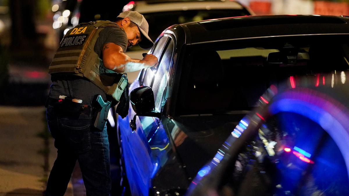 A member of the Drug Enforcement Administration (DEA) searches a vehicle for firearms, after U.S. President Donald Trump announces the federal takeover of the Metropolitan Police Department under the Home Rule Act and the deployment of the National Guard to assist in crime prevention in the nation’s capital, in Washington, D.C., U.S., August 15, 2025.