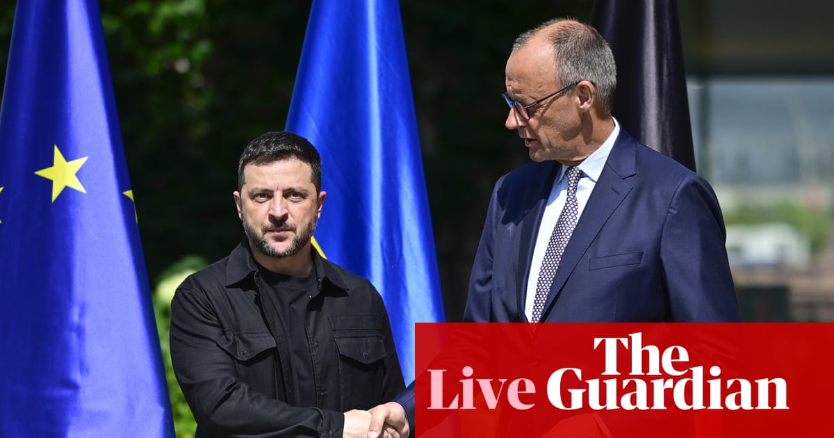 ShareMerz welcomes Zelenskyy in Berlin… and here they are, as Merz welcomes Zelenskyy in Berlin.Ukrainian president Volodymyr Zelenskyy is welcomed by German chancellor Friedrich Merz upon arrival in the garden of the chancellery in Berlin to join a video conference of European leaders with the US President on the Ukraine war. Photograph: John MacDougall/AFP/Getty ImagesShareUpdated at 12.01 BSTGermany’s Merz hosts Zelenskyy as weakened leader 100 days into his term — analysisDeborah Colein BerlinGermany’s chancellor, Friedrich Merz, hosts Zelenskyy as a weakened leader 100 days into his term.German Chancellor Friedrich Merz speaking to the media last month. Photograph: Sean Gallup/Getty ImagesA new poll shows the far-right Alternative für Deutschland overtaking Merz’s conservative CDU/CSU bloc by two points, making it the strongest party with 26% support in a fractured electoral landscape. The CDU/CSU, which won February’s general election with nearly 29% of the vote, now claims only 24% of voter intentions.The last time the AfD came out on top in the Forsa poll was in April, in a period of political limbo between election and Merz’s new government taking office in May.The junior coalition partners, the centre-left Social Democrats (SPD), have just 13% support, down three points from February, meaning that if the election were this weekend, the current governing alliance, which is already showing significant cracks, would fail to win a majority.Merz, for decades a divisive figure in German politics, has struggled to reverse a deep pessimistic streak that has taken hold in Europe’s top economy.GDP growth has failed to show a significant turnaround and is expected to flatline this year, while Merz’s campaign pledges for economic relief have not materialised.A decision by the government in June not to deliver a reduction in electricity tax for households and small businesses angered many voters, while a divisive debate about the pension age has also taken a political toll.More recently, an unusually bitter row over the planned appointment of a federal judge who fell victim to a right-wing-led media campaign against her liberal abortion stance caught Merz by surprise and eroded trust within the coalition.On migration, which Merz has attempted to wrest as an issue from the AfD, his government has shown mixed results with a series of court setbacks and a simmering border dispute with Poland complicating his efforts to show decisive action.Even before taking office, Merz spearheaded a major “bazooka” spending package for domestic defence, infrastructure and aid to Ukraine. But fiscal hawks within his own camp, who looked to Merz to safeguard German fiscal rectitude, were appalled by the measure they saw as a violation of his previous campaign promises.French President Emmanuel Macron, Canada Prime Minister Mark Carney, US President Donald Trump, British Prime Minister Keir Starmer, and German Chancellor Friedrich Merz prepare for a family photo during the G7 Summit, in Kananaskis, Alberta, Canada in June. Photograph: Suzanne Plunkett/ReutersMerz, who had no experience in government before becoming chancellor, has cut a more sure-footed figure on the world stage and won praise from many western allies for rallying European support for Ukraine as US president Donald Trump’s backing has wavered.However the formulation of his stance on the war in Gaza has proved to be a high-wire act, alienating many of his closest allies and the Israeli government even while drawing praise from the SPD.After weeks of ratcheting up his rhetoric criticising Benjamin Netanyahu’s military campaign in the Strip as the civilian toll rose, Merz last week made the shock announcement that Germany would no longer approve shipments of weapons that could be used in Gaza “until further notice”.Prominent members of the CDU/CSU bloc accused Merz of failing to inform them in advance of a decision they said betrayed Germany’s responsibility for Israel’s security since the Holocaust. Voters meanwhile welcomed the move, with large majorities criticising Israel’s military actions in Gaza.Der Spiegel columnist Nikolaus Blome pointed out the irony in attacks on Merz’s go-it-alone approach, noting that many in the CDU/CSU had sought a firmer line after Angela Merkel’s 16 years of centrist politics and Olaf Scholz’s perceived waffling.