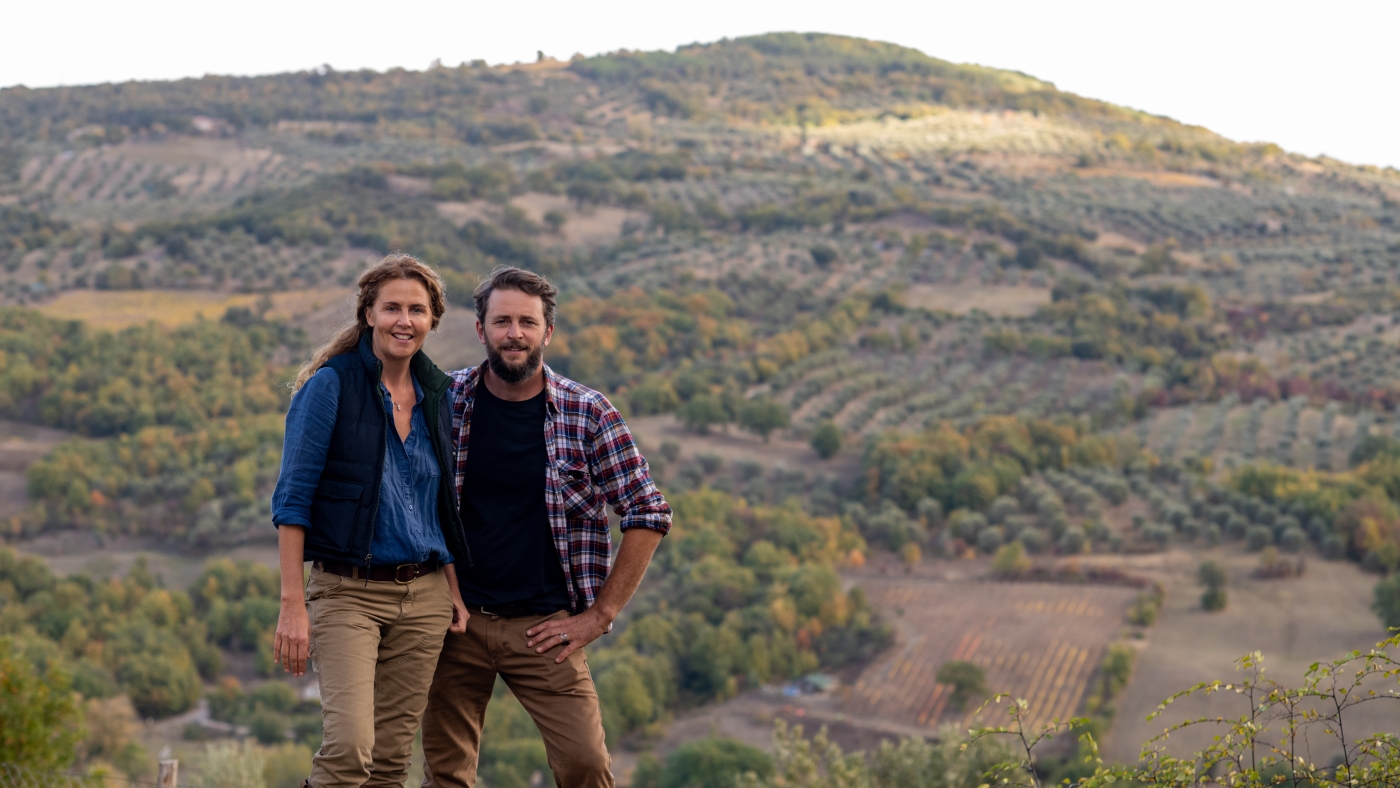 Siblings Marie-Charlotte Piro and Romain Piro stand among some of the olive trees they harvest in Tuscany, Italy, to create their olive oil. Their Olio Piro startup had been exporting all its olive oil to the United States — until new U.S. tariffs moved up their plans to start expanding elsewhere.