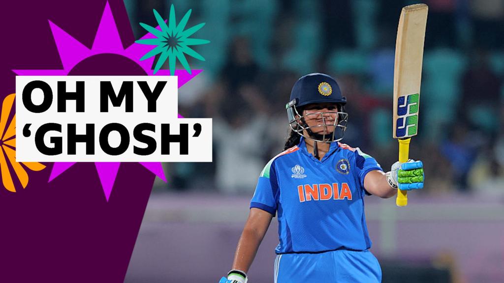 Richa Ghosh’s 94 runs off 77 balls, including 15 boundaries, helps save India’s innings as they recover from 102-6 to reach 251-8 against South Africa in their ICC Women’s Cricket World Cup match. FOLLOW LIVE: ICC Women’s Cricket World Cup – India v South AfricaAvailable to UK users only.