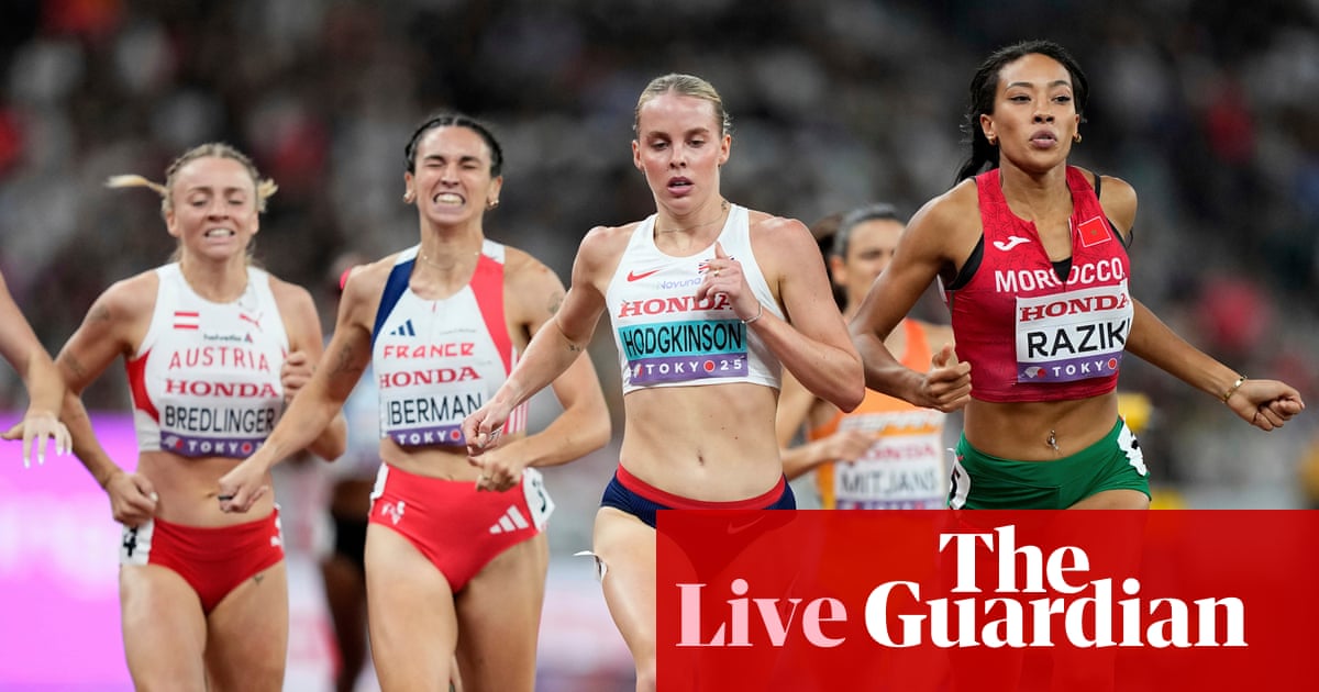 Key eventsShow key events onlyPlease turn on JavaScript to use this featureChopra of India, one of the favourites for the javelin and coached by the great Zelezny, is out, having failed to make the top eight after four throws.ShareWerro doesn’t move as nicely as Hodgkindson, but she’s got plenty of speed and speed endurance. Paula Radcliffe and Liz McColgan weren’t the most stylish runners, but they knew how to get from gun to tape well enough.ShareWerro wins in 1.58.43; Hurta-Klecker is second, with Wielgosz third, while Caldwell is currently the fastest loser.ShareWerro ups the pace, Moraa now well off it; Hurta-Klecker of USA is secure in second, while Caldwell of Australia has Wielgosz of Poland coming up behind her. She’s in trouble.ShareWerro goes to the front, passing Moraa, who then finds herself buffeted and dropping well off the pack; she recovers and is back in the race at the bell.ShareSwitzerland are having a bit of an athletic moment, and Audrey Werro, just 21, is one of the favourites for the women’s 800m. She goes in heat four, about to get going. The forecast rain has started.ShareUpdated at 12.24 BSTWalcott looks to be in rhythm, and extends his leading mark to 88.16. They’ve taken four of six throws.ShareBack to the final of the men’s javelin and Curtis Thompson, in third with 86.67, has different coloured shoes on. Photograph: Ashley Landis/APPeters of Grenada is second with 87.38; Walcott of T&T leads with 87.83, but below the medal positions are various of the favourites.ShareNow it’s to the third, Duguma of Ethiopia leading around the final bed, and she, along with Congdon of USA and Coiro of Italy pull away down the home straight to take the three semi-final spots. The winning time is 2.01.53 and Duguma looked really strong there.ShareMy Chrome crashes and I miss the second heat of the women’s 800; Bourgoin of France wins it in 1.58.43, with Moraa of Kenya second and Gajanova of Slovenia third.ShareThe state of this.